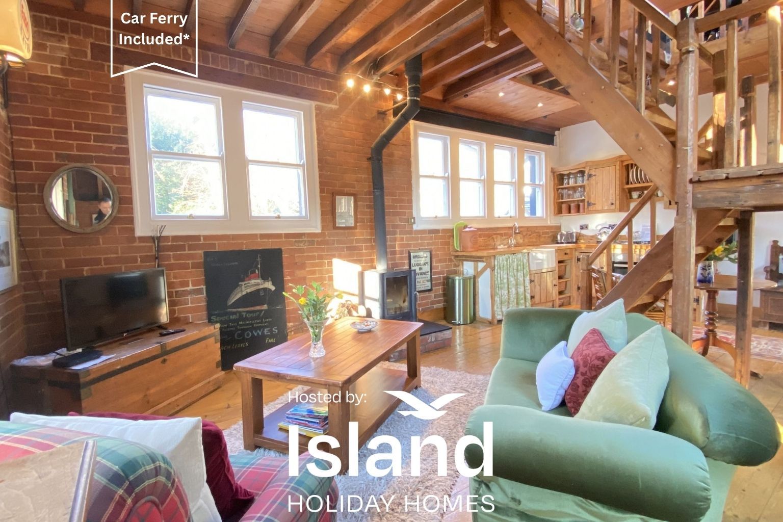 The Clock Tower enjoys a private entrance and is accessed via a external stairway to an elevated, south facing decked area from where the sea can viewed and soak up the sun and the peace and quiet. The front door leads into an open plan living, dining and kitchen which you will see from the photos is very inviting. The stairs in the centre of living area lead to a mezzanine area that can be used, but the head height is restricted and is more of a feature than an every day usable space. The living area has a comfy sofa and easy chair positioned in front of a contemporary styled wood burner. There are limited sea views from the south westerly facing window and with the additional sky lights the room is light and airy.