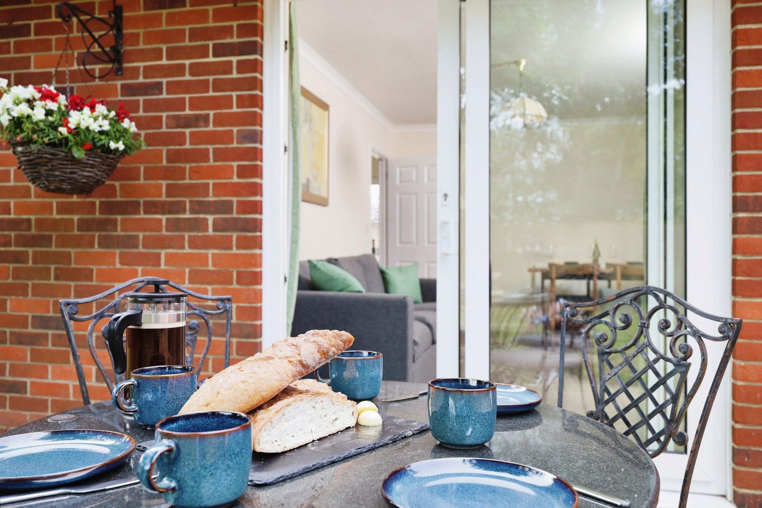 Lounge enjoying the garden views through the patio doors, One sofa and wingback chair. Dining table for 4 People.
