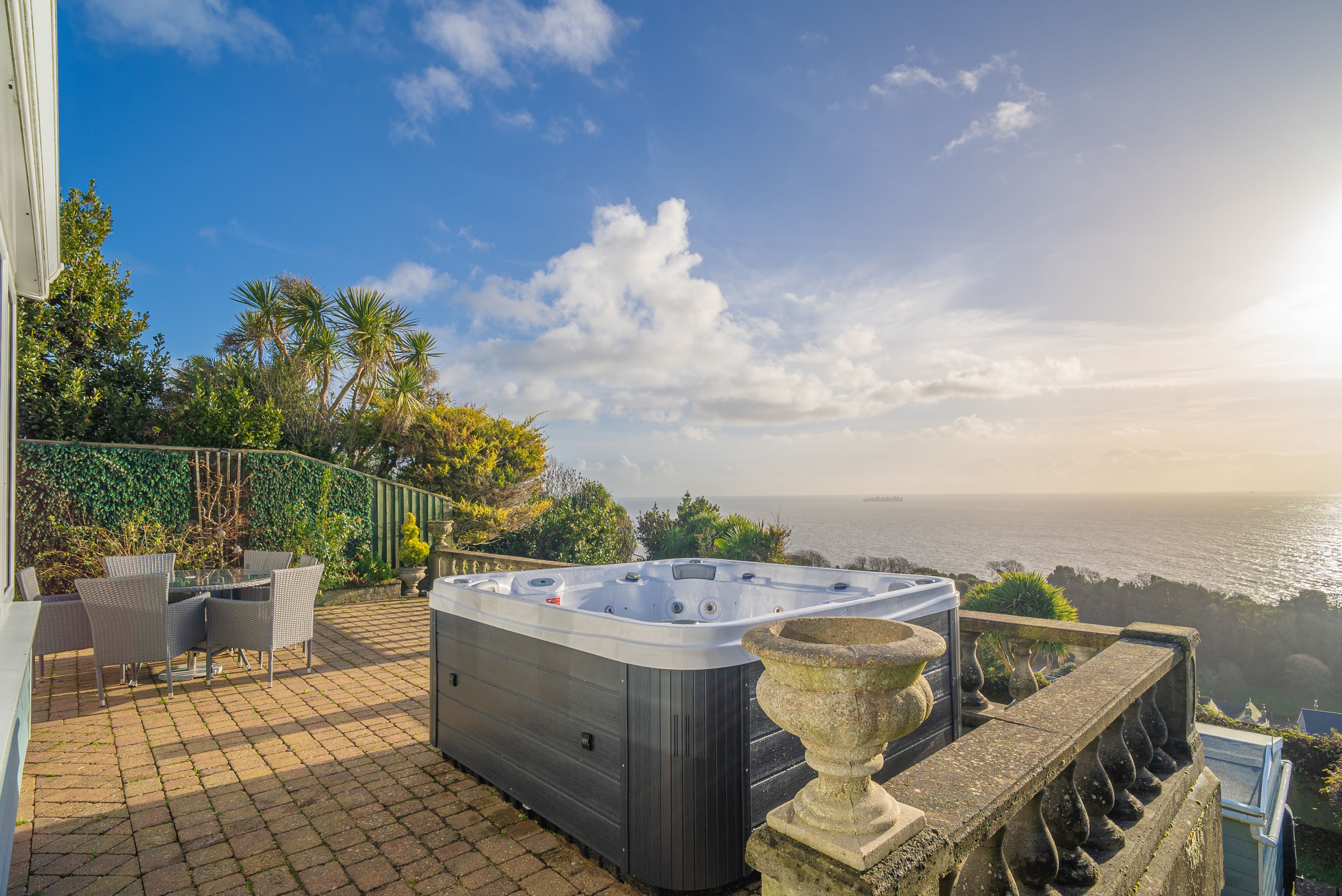 Outside, the garden is designed for easy enjoyment. A large paved terrace provides the perfect spot for outdoor dining, morning coffee, or evening drinks, and features a private hot tub (if you would not like to use it please let us know and we can remove the charge for this) positioned to take full advantage of the breathtaking sea views. Relax in the warm bubbles while watching the boats sail past or enjoying unforgettable sunsets over the English Channel. Steps lead down from the terrace to a lawned area, creating a peaceful and private outdoor space.